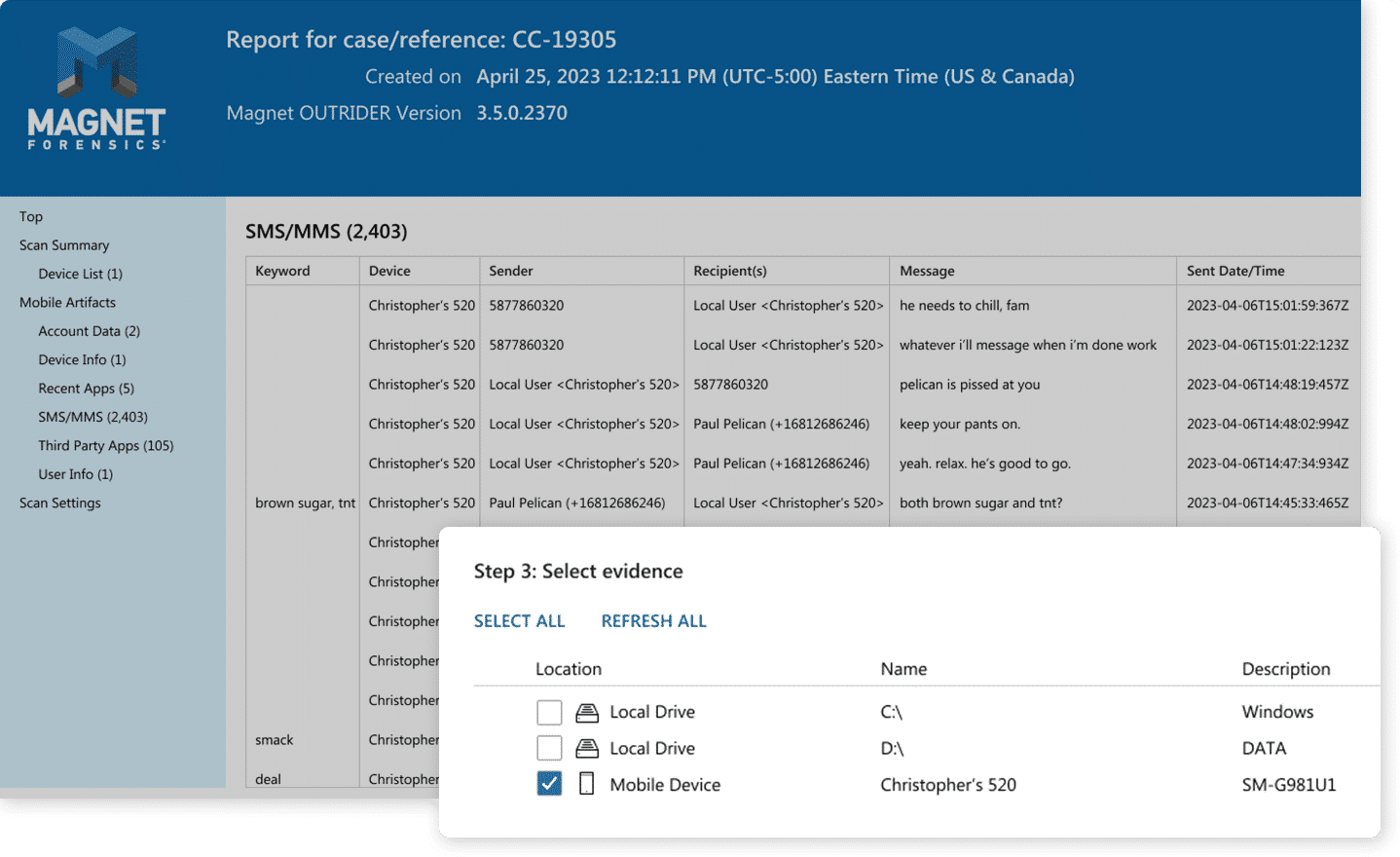 Save valuable time in the field or in the lab by using Magnet Outrider to quickly scan iOS and Android mobile devices and automatically uncover SMS/MMS messages, illicit apps, device ID, recently used apps, contact list, call logs, and more, in minutes.