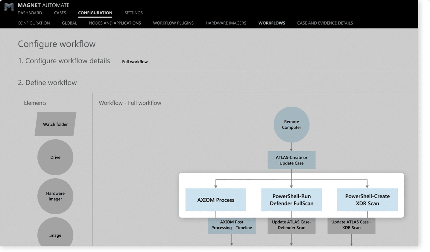 Der Drag-and-Drop-Workflow-Builder von Automate erleichtert die Entwicklung effizienter, automatisierter und individuell auf jeden Falltyp zugeschnittener Workflows über Ihr gesamtes forensisches Toolkit hinweg.