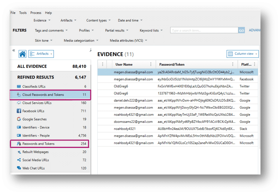 Magnet AXIOM automatically identifies passwords and tokens in the refined results.
