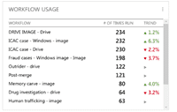 Workflow Usage: Lab managers can use this information to show how often a workflow is used. This will give the lab manager the ability to track trends around how often a workflow is used (or not) to help them identify efficiencies in the lab, as well as what skills may be required if they’re planning to hire new examiners. This module can also help you make data-backed decisions about procurement if a certain workflow and associated tools are underused.