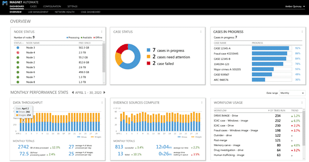The Overview and Case Dashboard provides lab managers with a high-level overview of lab operations and efficiency metrics to drive lab improvement and resourcing decisions. These new management dashboards allow you to assess overall data throughput, workflow usage, cases in progress and the number of evidence sources processed.