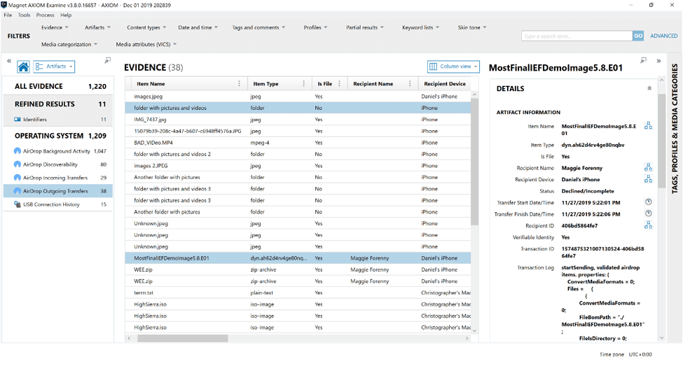 With this artifact we’ve also included a snippet from the unified log for examiners to review. This transaction log will validate information we’ve processed for this artifact. Utilizing the first and last lines of the log for this event is how AXIOM coordinates the start and end times of each AirDrop Incoming Transfer. As with the other AirDrop artifacts that have timestamps, the Incoming Transfers artifact times are also UTC. If an AirDrop transfer has more than one file attached to it, it will produce a separate Incoming Transfer artifact hit for each file, however examiners can utilize the transaction log to identify and correlate those entries when examining the evidence.